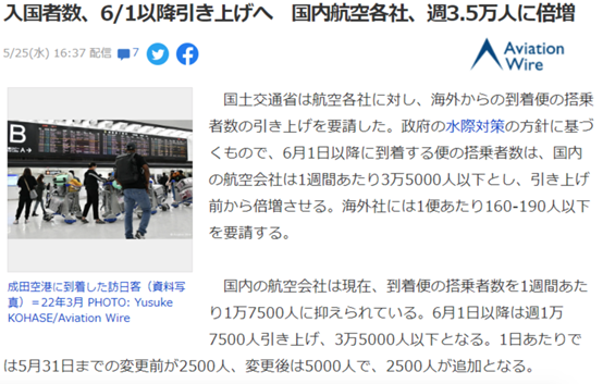 6月開始,日本將提高海外飛往日本的航班搭乘人數