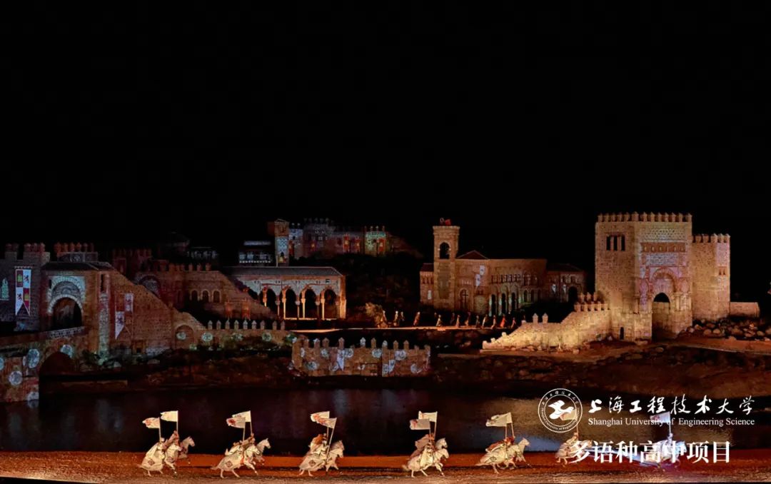 而令我印象尤為深刻的是晚上的演出:實(shí)景的城堡、湖水、風(fēng)車、城墻借助了特殊燈光的加持能夠得以用很快的速度變化布局。照射在城堡上的燈光流轉(zhuǎn),帶我們領(lǐng)略著西班牙千年以來的變化。