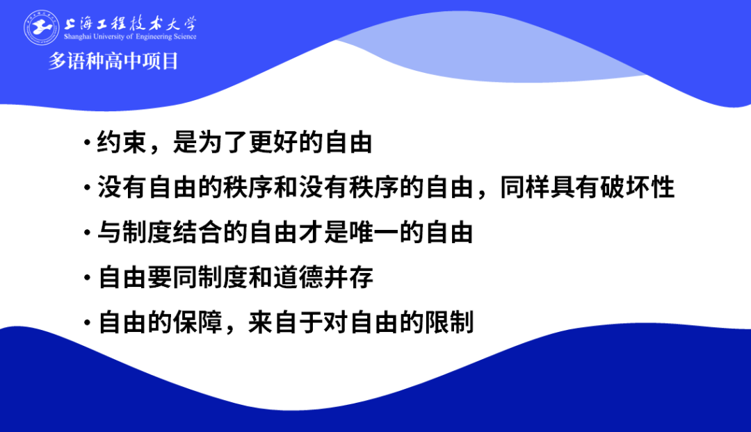 3月15日下午,在上海工程大多語種高中項目24級春季班的綜合素養課上,由葉宇宏老師帶領同學們開展了一場有關“自由與規則”的深入探討。