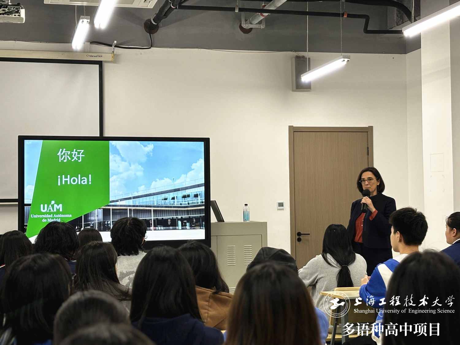 本周,公立馬德里自治大學(Universidad Autónoma de Madrid)的Irene Martín副校長親臨本校,為上海工程技術大學多語種高中項目西班牙語班同學展開升學講座。