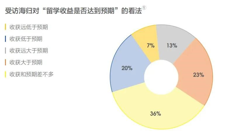 受訪海歸中近四分之三的人對“留學收益是否達到您的預期”持肯定態(tài)度。其中“收獲和預期差不多”、“收獲大于預期”、收獲遠大于預期”分別占比36%、 23%、13%。