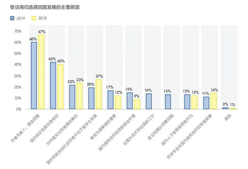 “方便與家人、朋友團聚”成為海歸回國發(fā)展的最主要原因,占60%。