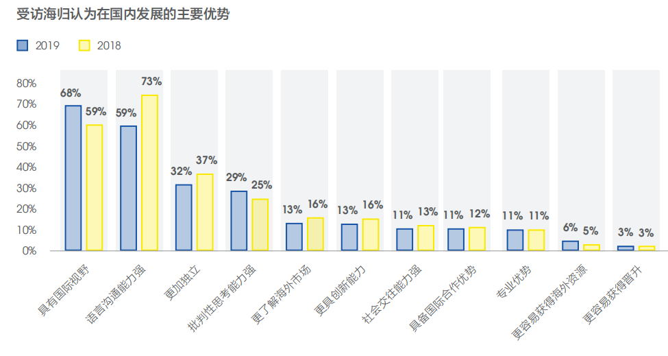 2018年,“語言溝通能力強”是海歸就業(yè)的最大優(yōu)勢。然而2019年,選擇“具有國際視野”的海歸占比增加至68%,趕超語言溝通能力成為No.1。隨著國內(nèi)高校教育理念的國際化以及對于語言教育的重視,受訪海歸認為其在國內(nèi)發(fā)展的語言優(yōu)勢正逐漸下降,而國際視野帶來的優(yōu)勢則隨著我國全球化發(fā)展的日益深入而不斷提升。