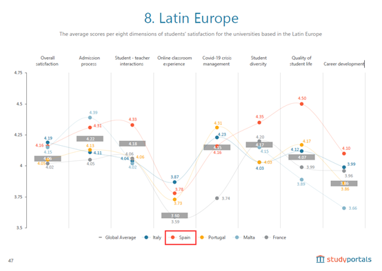 根據 2021 Studyportals Student Satisfaction Report,西班牙、奧地利、愛沙尼亞、匈牙利和意大利位列前五名。英國排名第七,在英語學習目的地中排名第一。其他 “四大”英語目的地包括澳大利亞(第 10 位)、美國(第15位)和加拿大(第21位)。