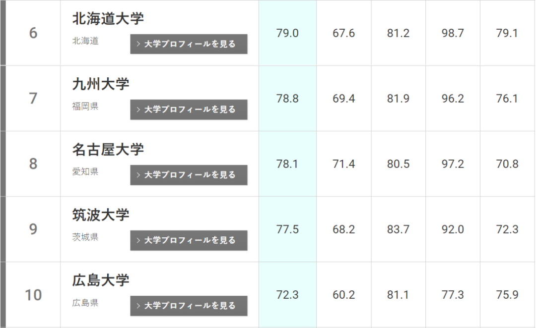 大阪大學排名上升兩位(去年第五),和東京工業大學(去年第二)并列第三。京都大學(去年第四)位居第五。