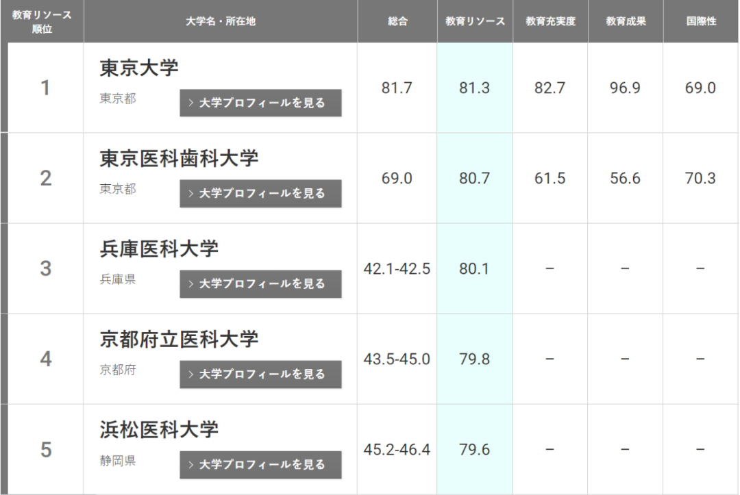至于各個領域的排名,有三個領域的榜首大學保持不變,即東京大學在 “教育資源”、秋田國際大學在“教育充實度”,京都大學在“教育成果”方面均保持了日本第一的位置。而立命館亞洲太平洋大學首次在 “國際化環境”領域排名第一。