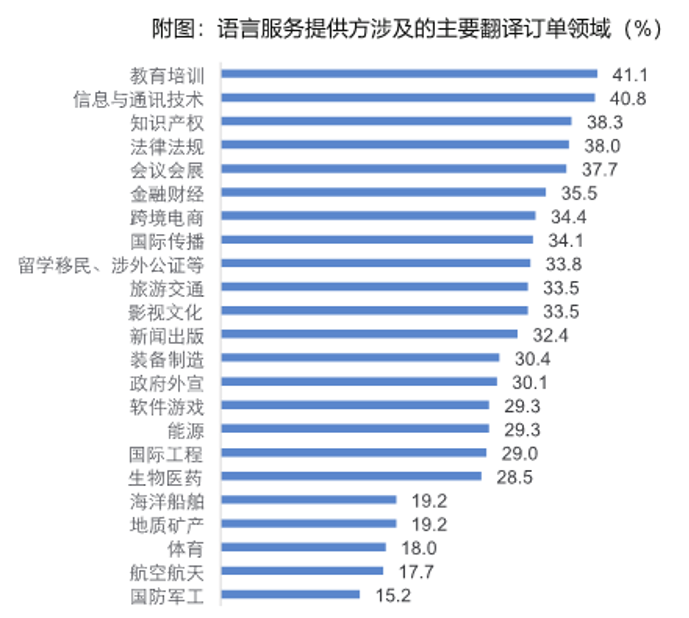 隨著翻譯領(lǐng)域和內(nèi)容的日益多樣化,翻譯人才隊(duì)伍發(fā)展對(duì)各領(lǐng)域起到了重要支撐作用。其中,教育培訓(xùn)、信息與通訊技術(shù)、知識(shí)產(chǎn)權(quán)是最主要的翻譯業(yè)務(wù)領(lǐng)域,分別占了41.1%、40.8%、38.3%。