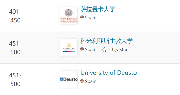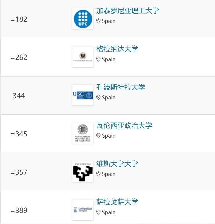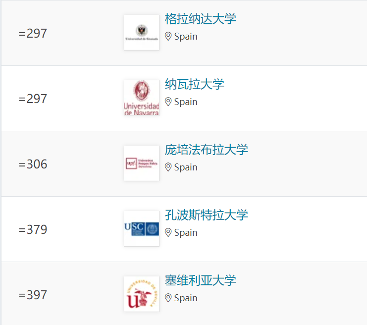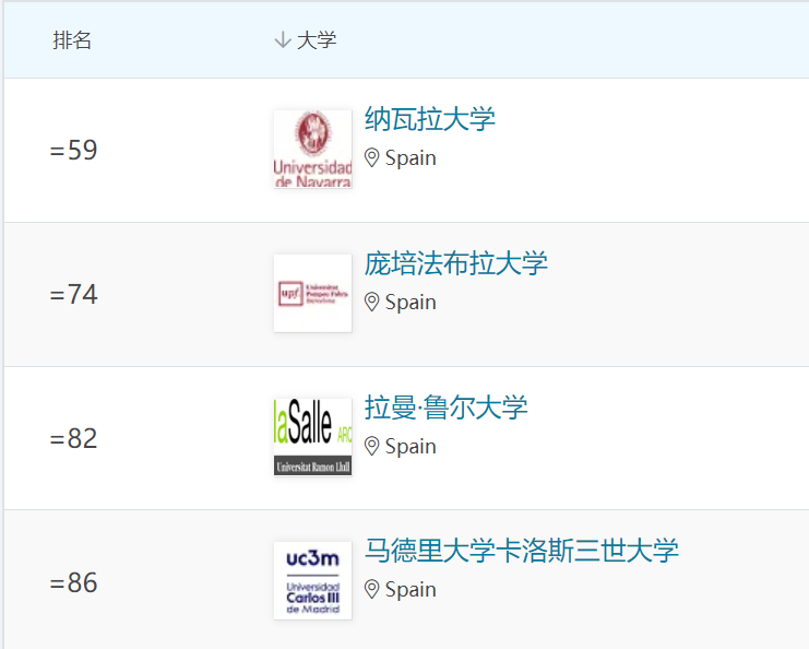 納瓦拉大學、龐培法布拉大學、拉曼·魯爾大學、卡洛斯三世大學和巴塞羅那自治大學躋身世界百強之列。