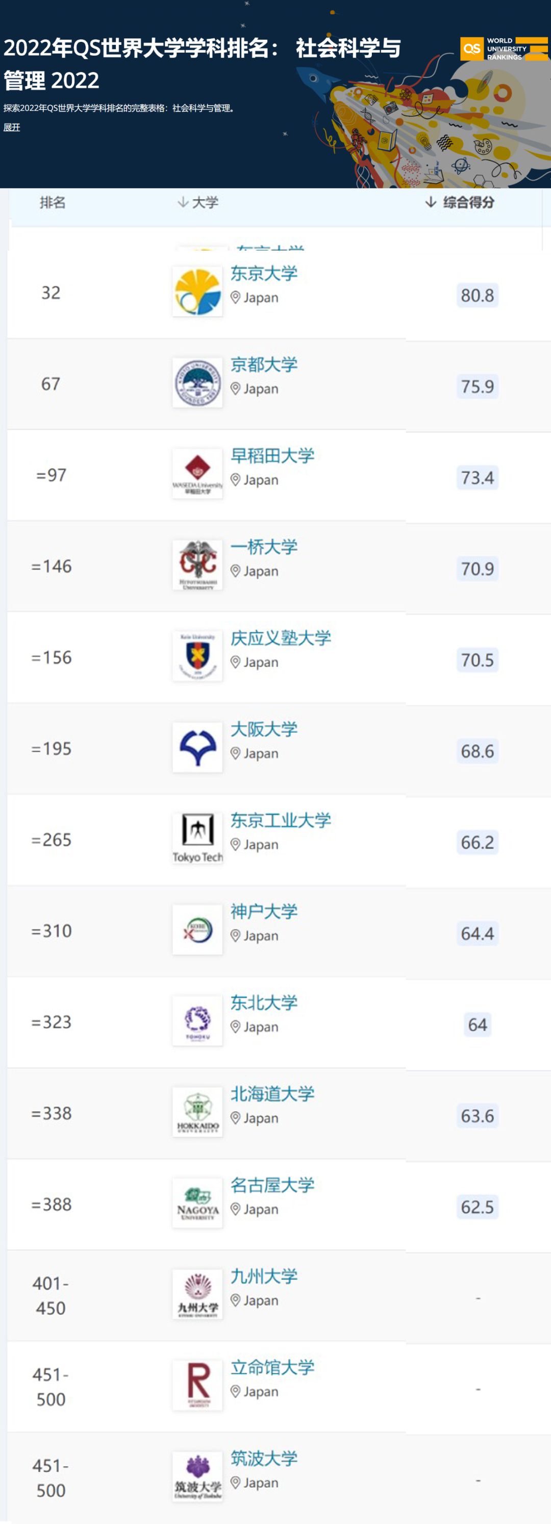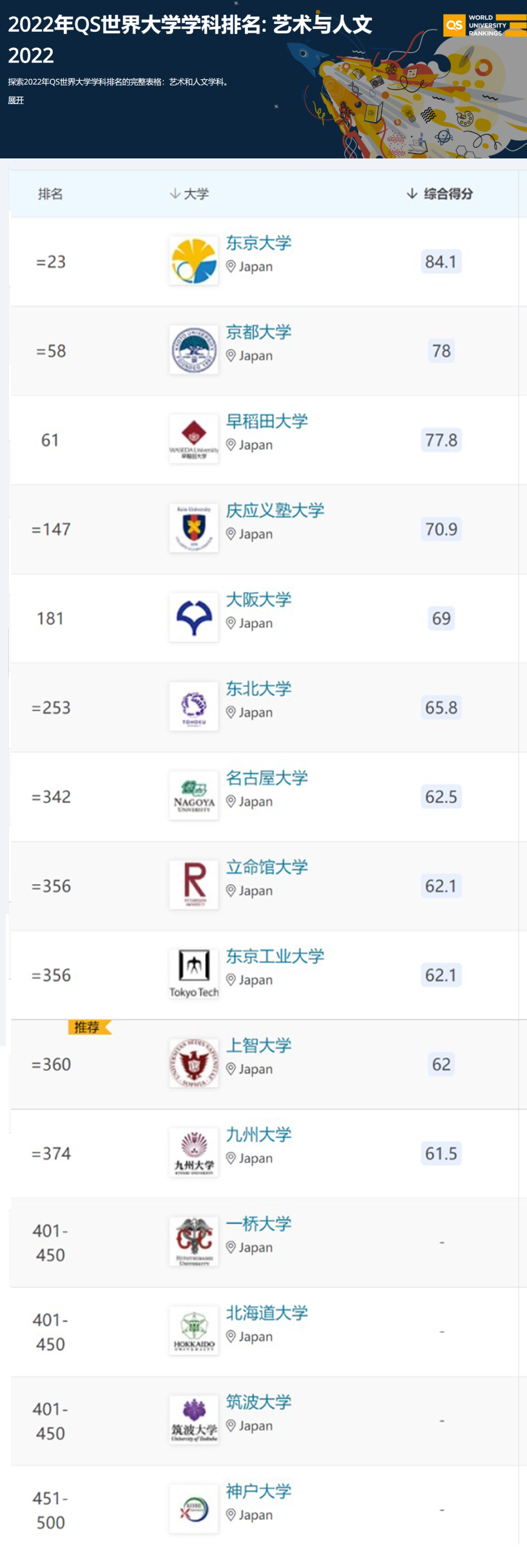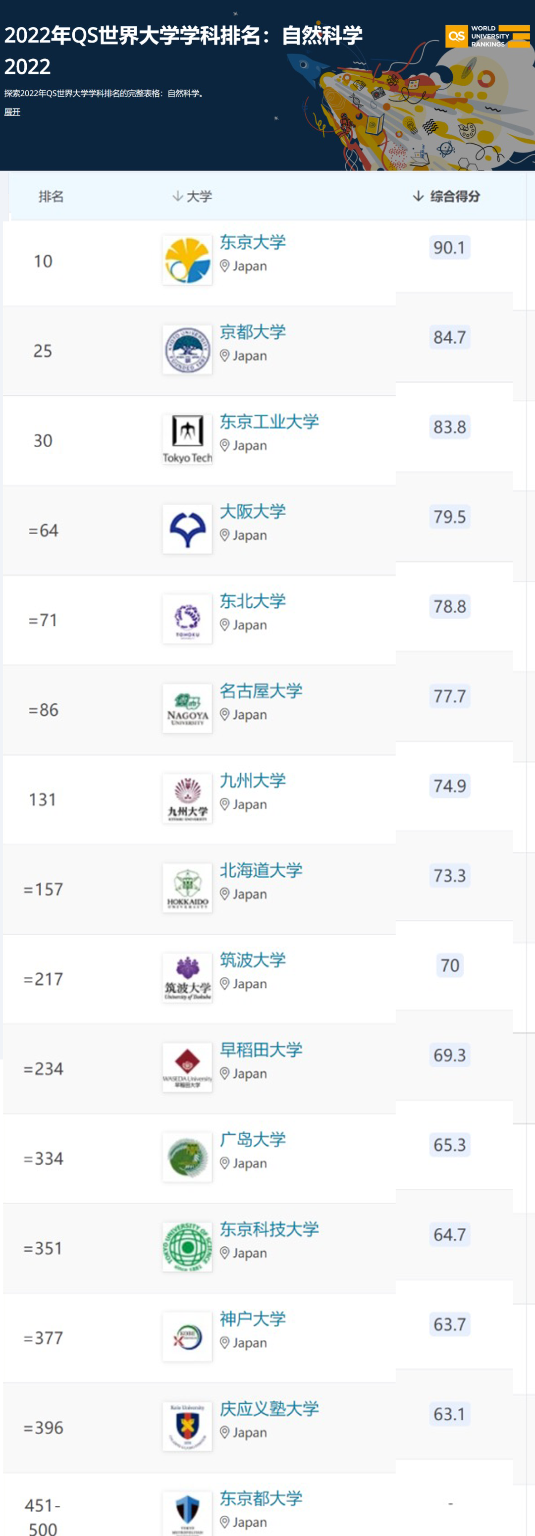 東京大學(xué)、京都大學(xué)、早稻田大學(xué)排名前100;應(yīng)慶義塾大學(xué)和大阪大學(xué)排名前200;名古屋大學(xué)、東京工業(yè)大學(xué)、北海道大學(xué)等排名世界500強(qiáng)!