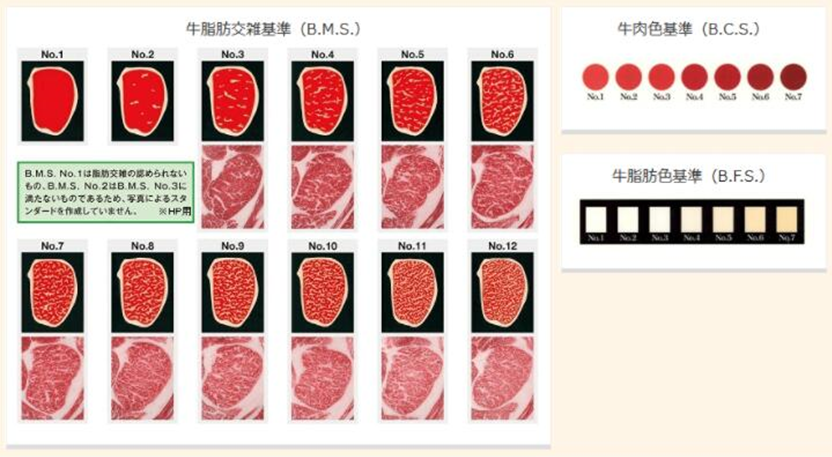 日本是對(duì)于牛肉等級(jí)分級(jí)最嚴(yán)格的國(guó)家,從和牛出生開(kāi)始就需要登錄血統(tǒng)證明、蹄紋、命名等身分證明,達(dá)重后會(huì)透過(guò)由日本食肉格付協(xié)會(huì)所制定的牛肉分類制度,做出評(píng)級(jí):根據(jù)和牛步留等級(jí)(A、B、C)與肉質(zhì)等級(jí)(1~5)兩個(gè)辨別標(biāo)準(zhǔn)分出15個(gè)等級(jí)。