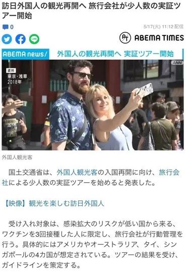 5月17日,根據當地媒體報道,日本政府將實施一個試驗型旅行項目,開始試點外國游客入境,在本月底前恢復接收外國游客,不過這批最新入境的游客僅面向4個國家。這4個國家分別是:美國、澳大利亞、新加坡和泰國。