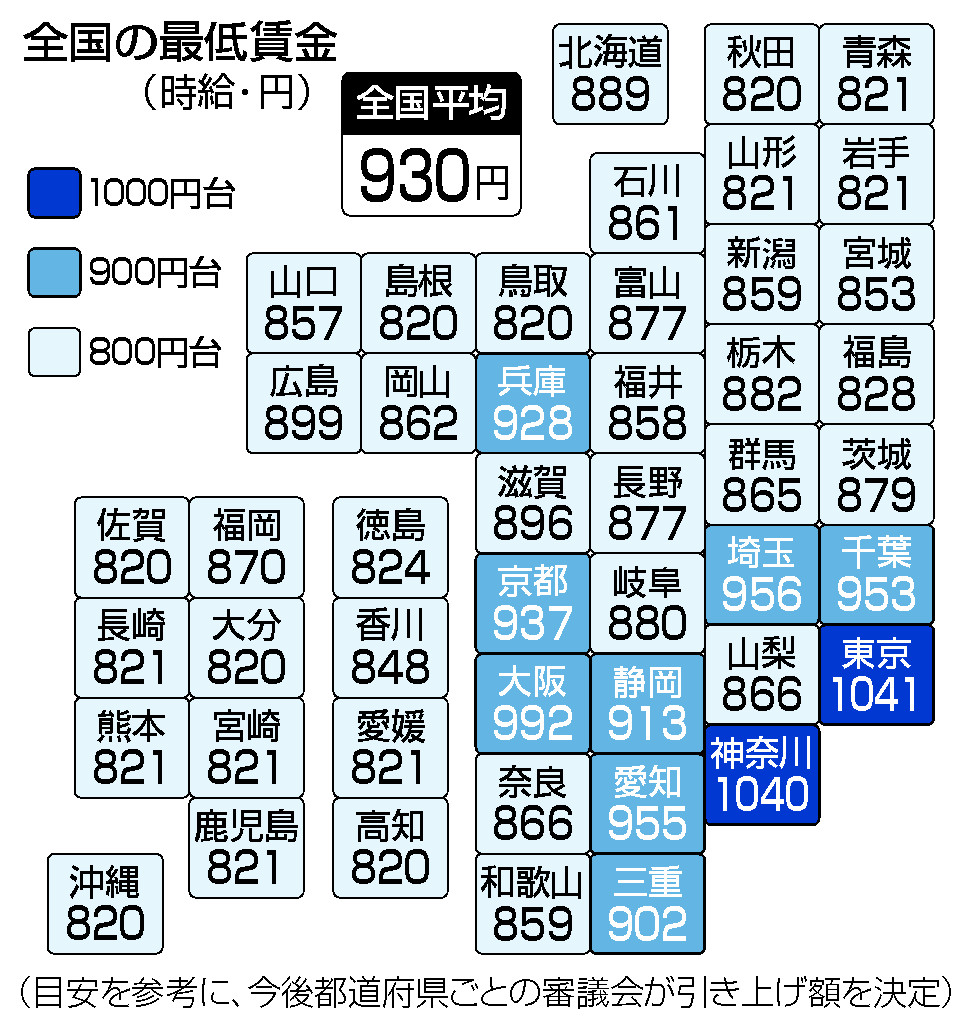 日本現在的平均時薪為930日元,這次平均時薪上調了31日元,達到2002年度采用現行方式以來的最大幅度。新的金額將從10月前后開始適用。