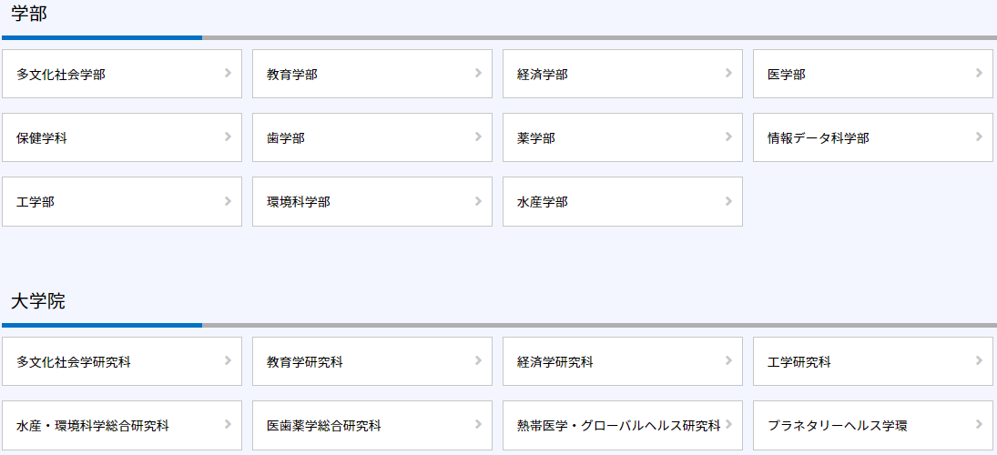 長(zhǎng)崎大學(xué)擁有11個(gè)學(xué)部,分別為多文化社會(huì)學(xué)部、教育學(xué)部、經(jīng)濟(jì)學(xué)部、醫(yī)學(xué)部、齒學(xué)部、藥學(xué)部、工學(xué)部、環(huán)境科學(xué)部、情報(bào)數(shù)據(jù)學(xué)部以及水產(chǎn)學(xué)部等,同時(shí)還涵蓋了多元文化社會(huì)研究科、教育學(xué)研究科、經(jīng)濟(jì)學(xué)研究科、工學(xué)研究科、水產(chǎn)/環(huán)境科學(xué)研究科、醫(yī)齒藥學(xué)綜合研究科、熱帶醫(yī)學(xué)研究科等八個(gè)研究科。