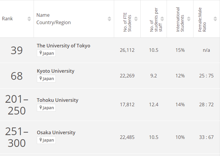 排在日本第3位的是世界排名201-250位的東北大學(跟去年一樣)。接著是251-300位的大阪大學(去年301-350位)、301-350位的名古屋大學(前一年351-400位)。