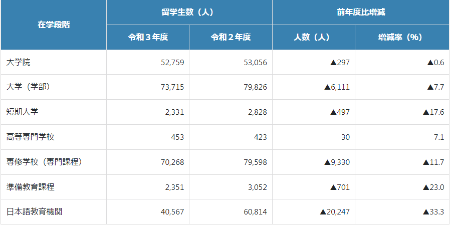 這份調查每年都會發布一次,統計對象包括大學(含大學院)、短期大學、高等專門學校,專修學校、為進入日本大學而設置的教育設施以及日語教育機關等的在籍外國人留學生。