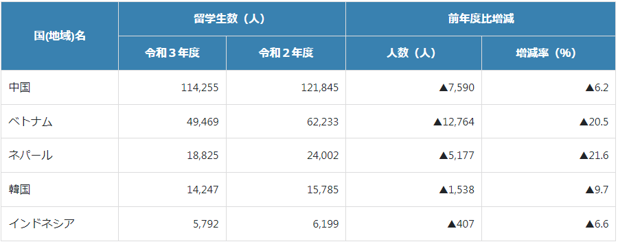 在日的外國留學生中, 中國的留學生最多,為114255人,占總數的47.1%,中國已成為日本國際學生最大生源國。