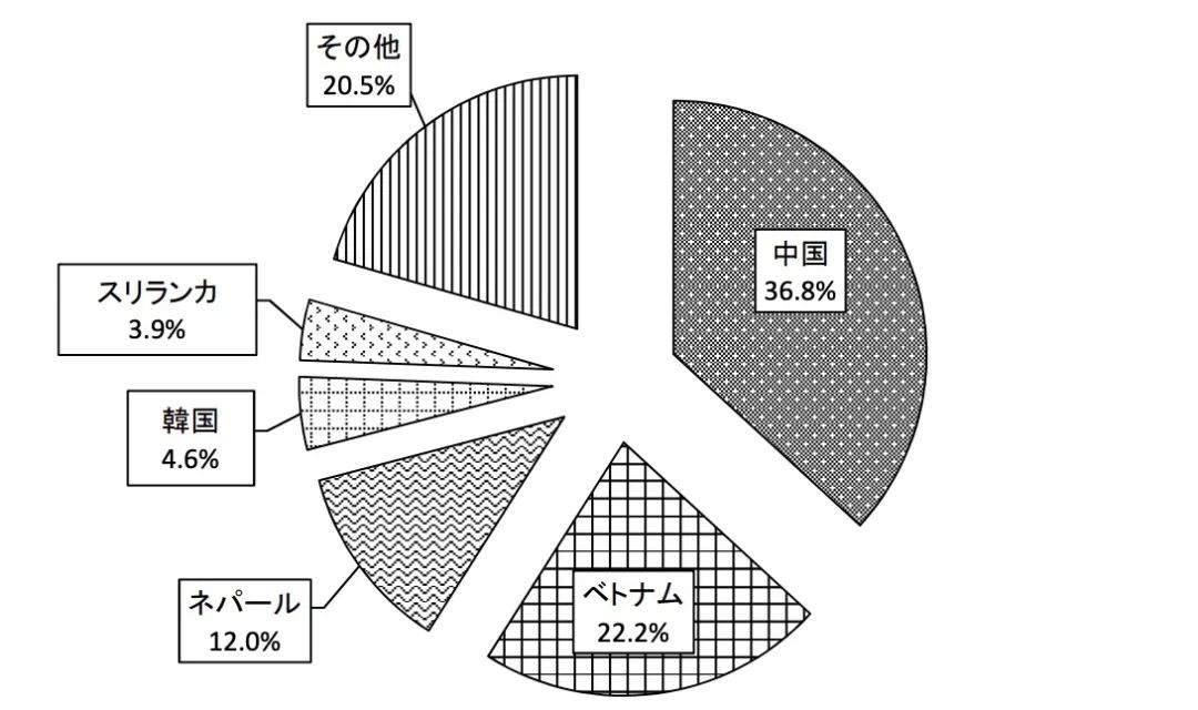 其次是越南,在日越南留學生人數為49469人,占總人數的20.4%;第三位是尼泊爾,人數為18825人,占總人數的7.8%;第四位是韓國,人數為14247人,占總人數的5.9%;第五位是來自印度尼西亞的留學生,人數為5792人,占總人數的2.4%。
