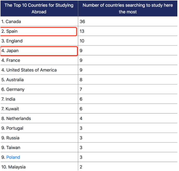 國際金融服務公司Remitly通過谷歌搜索數據,分析了164個國家/地區的居民搜索留學目的地的情況。全球最想去的留學國家/地區排名:西班牙,榮登第2位排名;日本則排位第4,超過法、美、澳、德等國家。