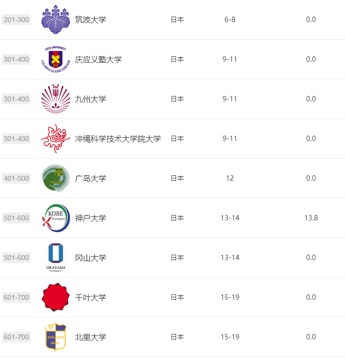 ◆北海道大學、東北大學(仙臺)、筑波大學、慶應義塾大學、九州大學、沖繩科學技術大學院大學、廣島大學位于世界前500強。