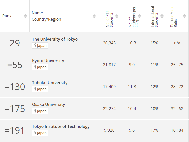 東北大學、大阪大學和東京工業大學本次全部進入TOP 200。