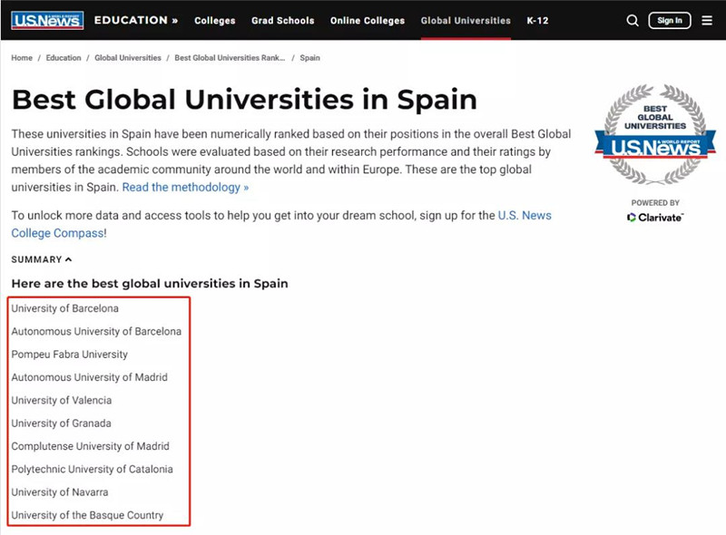 西班牙高校前十榜單:(1)巴塞羅那大學、(2)巴塞羅那自治大學、(3)龐培法布拉大學、(4)馬德里自治大學、(5)瓦倫西亞大學、(6)格拉納達大學、(7)馬德里康普頓斯大學、(8)加泰羅尼亞理工大學、(9)納瓦拉大學、(10)巴斯克大學