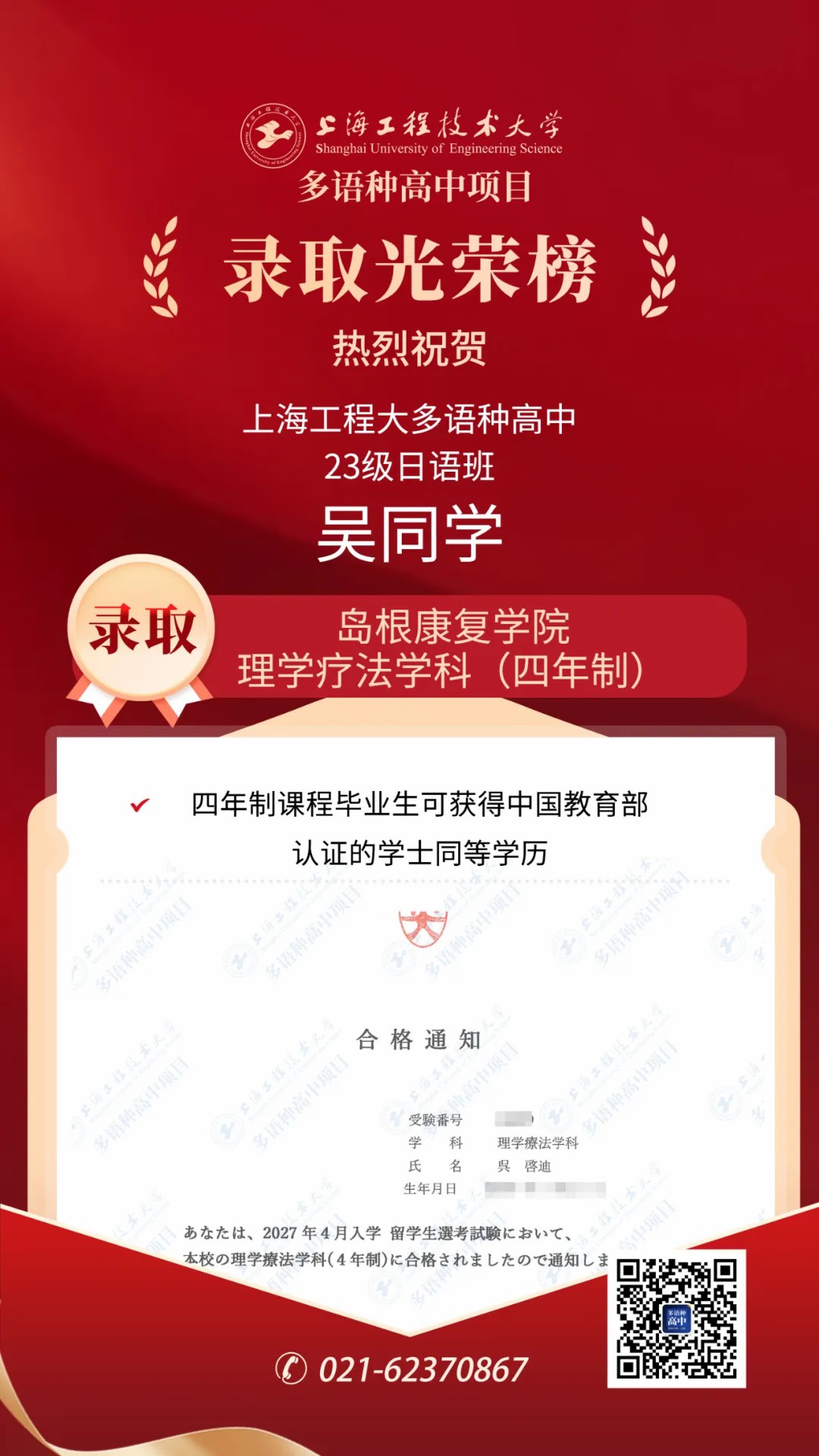 “兒子想過著有價值的人生,并且擁有了人生的目標。”——這是上海工程技術(shù)大學多語種高中23級日語班吳啟迪同學家長的由衷感慨。如今,這個目標正在清晰的化為現(xiàn)實:近日,我校高三學生吳啟迪憑借卓越的日語能力與清晰的職業(yè)規(guī)劃,在高三上學期成功斬獲日本島根康復(fù)學院的錄取通知書,比常規(guī)升學路徑整整提前了一年,激動人心地叩開了夢想之門。